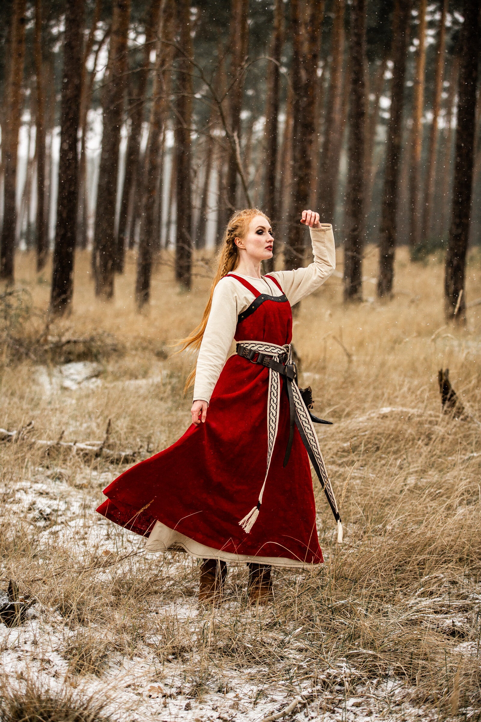 Wikinger Leinen-Überkleid – Rot | Lederapplikationen & Rückenschnürung